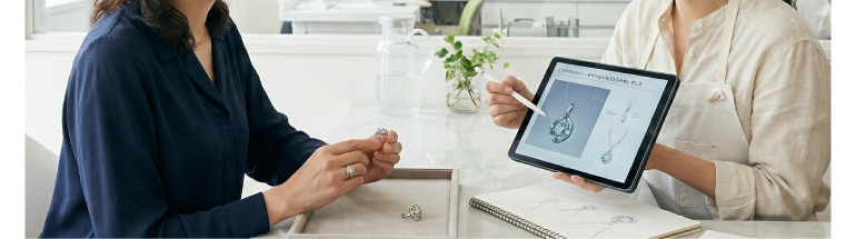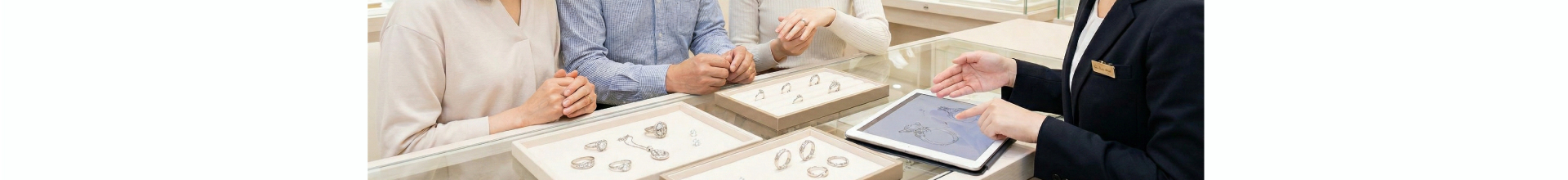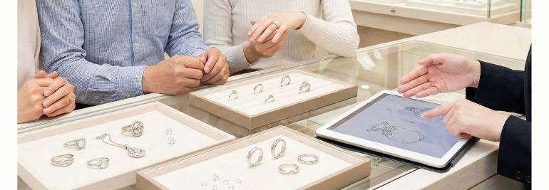 もちろん大丈夫です。店頭にある豊富なサンプルリング(空枠)をご自身の指に通して試着したり、過去の製作実績のアルバムなどを見ながら、コンシェルジュがお客様のライフスタイルや好みに合わせて提案してくれます。