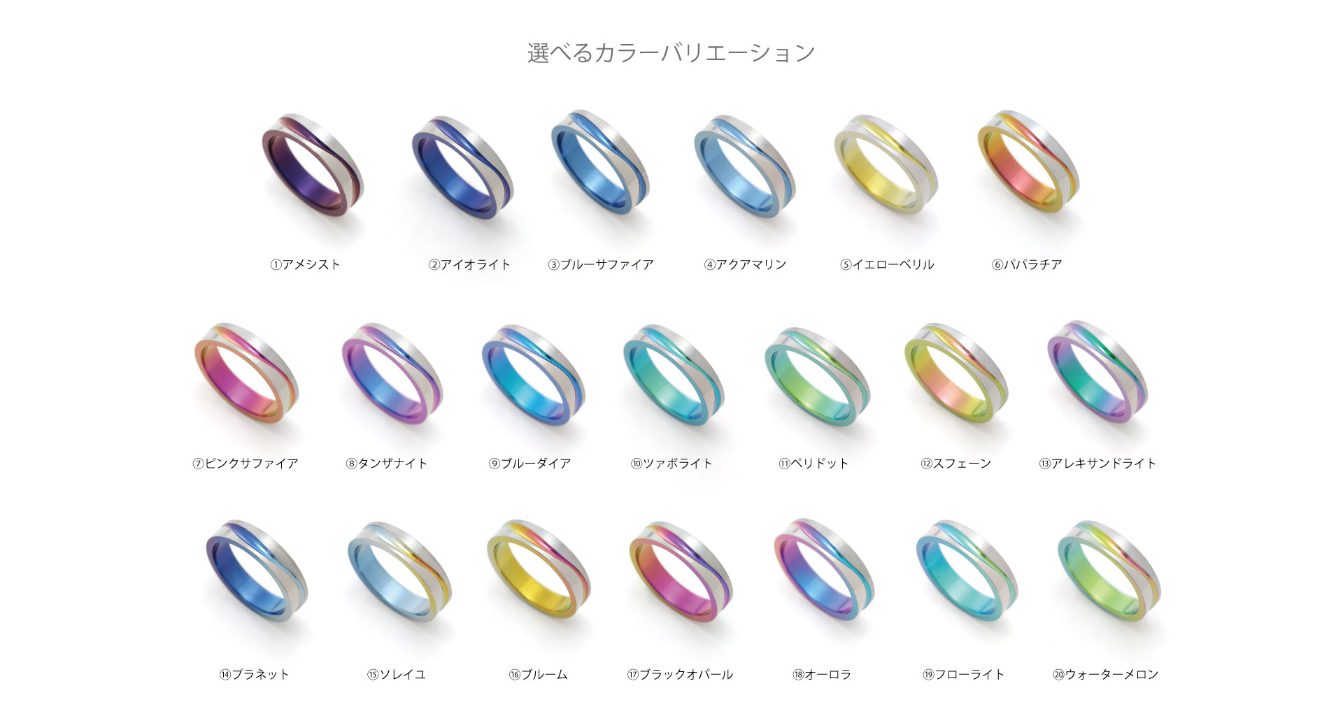 SORAでは、特殊な技術で化学反応をさせてジルコニウムの表面に酸化皮膜をつくりだします。その皮膜に光が当たることで私たちの目に色彩が見えるという仕組みです。塗料や着色ではないので、色が剥げるということはありません。色のある結婚指輪は他の誰とも被ることはなく、ふたりだけのオリジナリティ溢れる指輪が手に入ります。