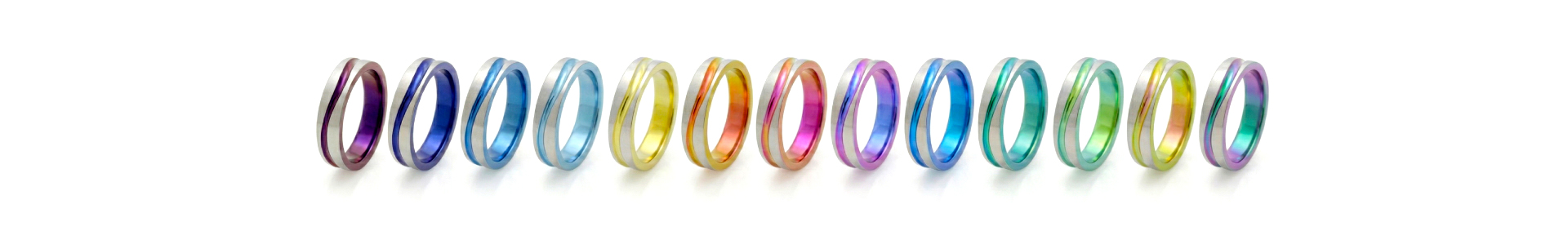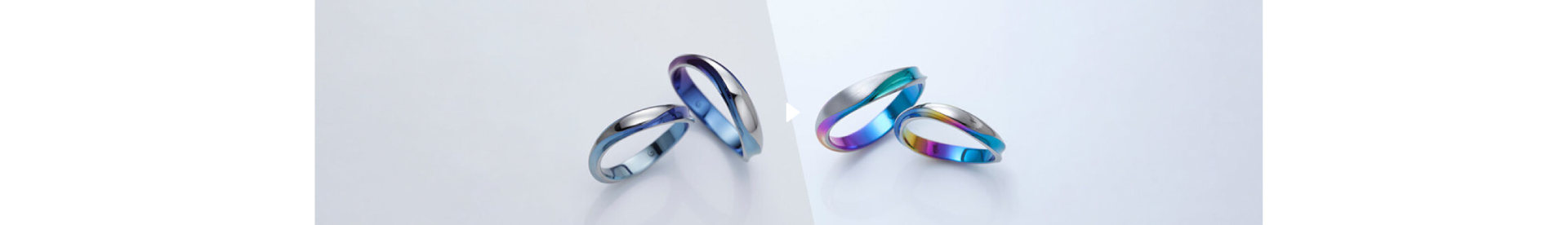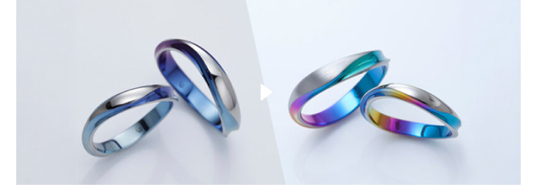 指に着けている時はシンプルなプラチナのような銀色に見え、外した時やふとした瞬間にだけ、ふたりにしか分からない鮮やかな色が輝きます。