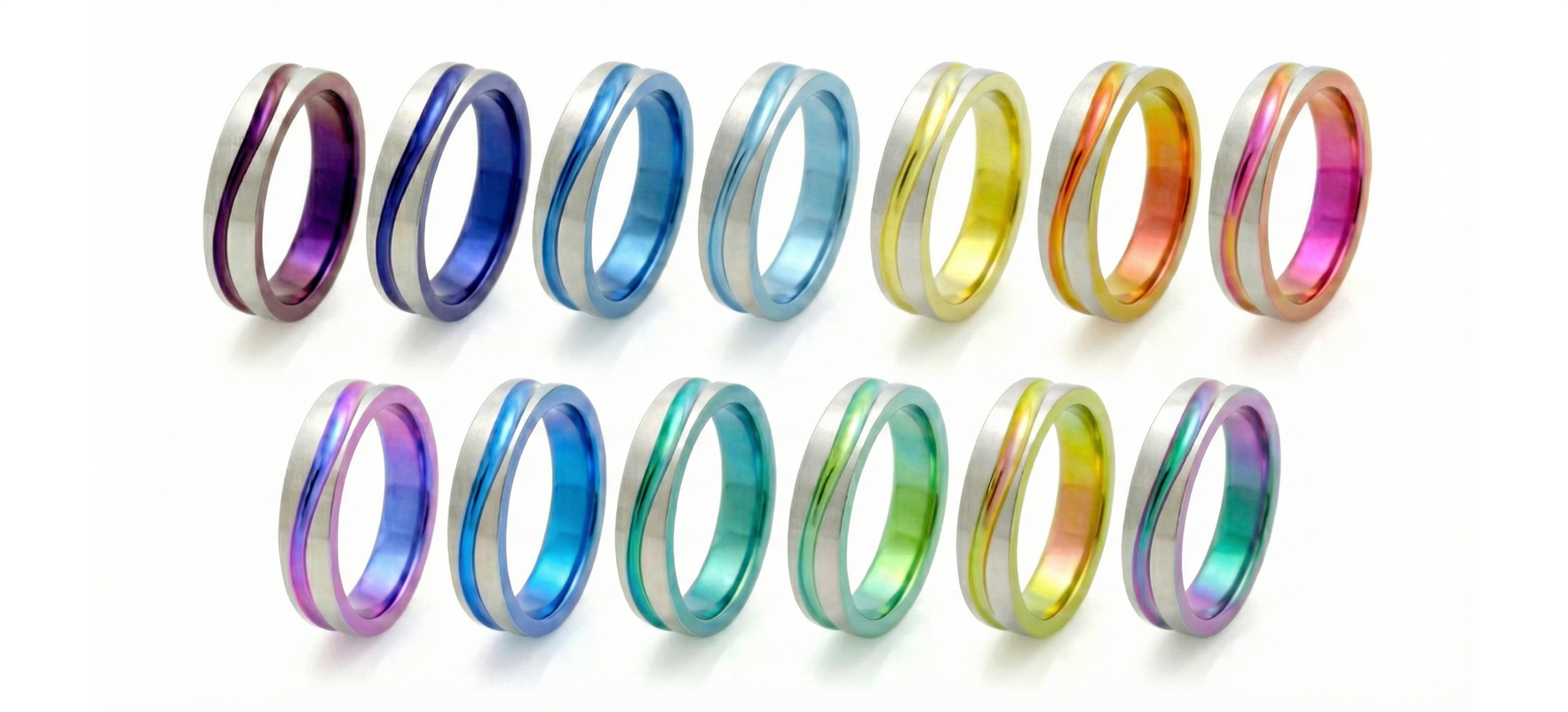 アレルギーフリーのレアメタル「ジルコニウム」の表面に透明な酸化皮膜を作り、シャボン玉やプリズムと同じ「光の屈折(構造色)」を利用して色を生み出します。金属そのものが透き通るように輝くため、ポロポロと剥がれることはなく、圧倒的な美しさを放ちます。