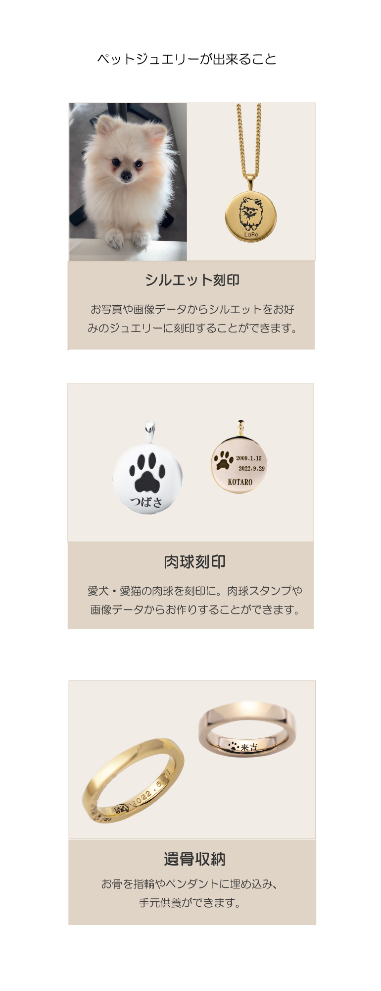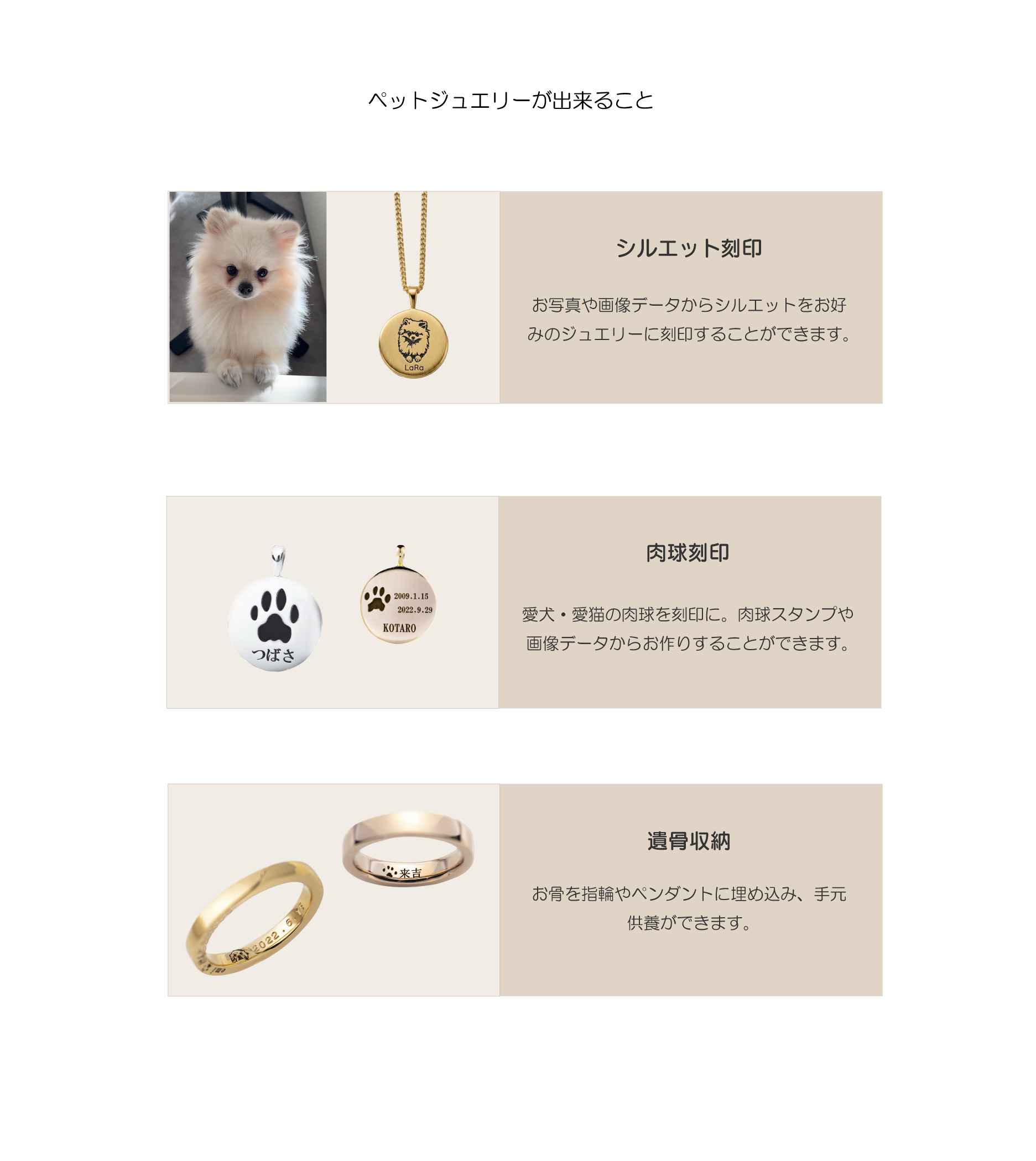 ふとした時に手に取れる、あなただけのお守りとして。どんな時も一番そばに感じられるように。しっぽを振って駆け寄ってくる可愛い姿も、虹の橋から見守ってくれている優しい存在も。言葉にできない「大好き」の気持ちを、形にしてみませんか?私たちは、愛犬や猫との絆をつなぐオーダーメイドジュエリーをお作りしています。